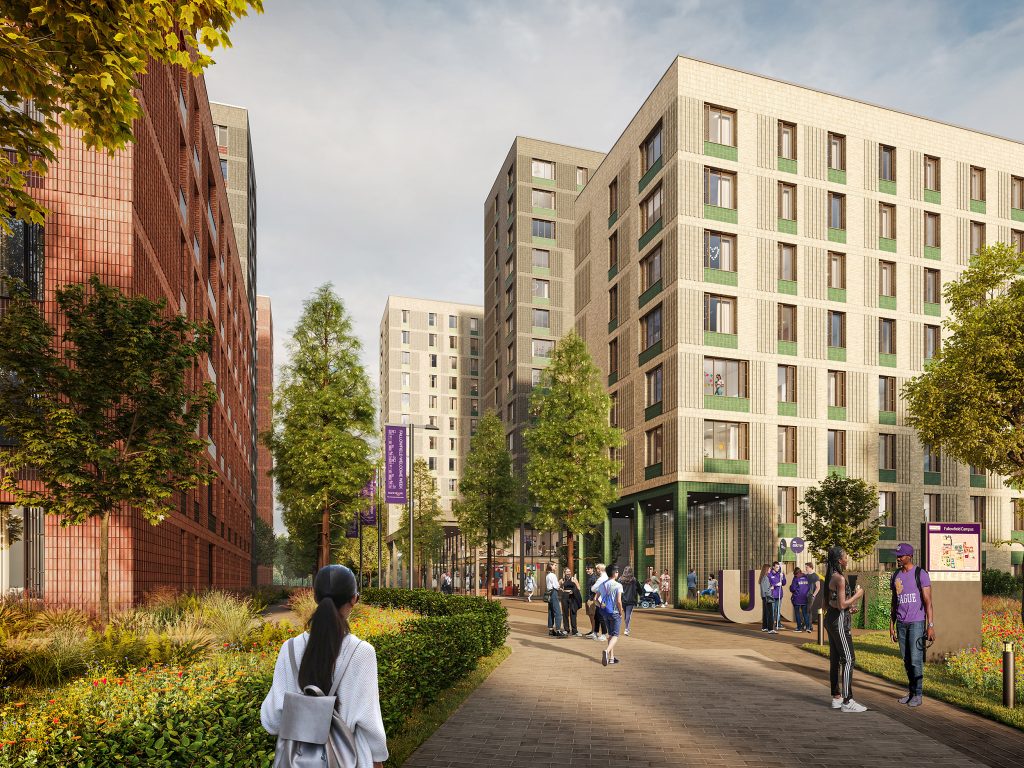 The Fallowfield Campus redevelopment will deliver up to 3,300 modern, high-quality student homes across the previous sites of Owens Park, Oak House and Woolton Hall, alongside amenity spaces and extensive green infrastructure. The project, designed by architects, Sheppard Robson, will create five distinct neighbourhoods, each inspired by Manchester’s cultural, sporting and musical heritage. The scheme is targeting Passivhaus certification and, once achieved, will become the largest certified Passivhaus project in Europe. It is also pursuing a BREEAM Excellent rating, with Modern Methods of Construction helping to enhance efficiency, reduce waste, and accelerate delivery.